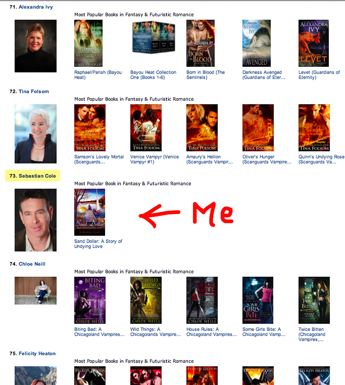Having released my debut novel, Sand Dollar: A Story of Undying Love, it’s cool to see that I now have an Amazon Author Rank: #73 in Books / Romance / Fantasy. Apparently, Amazon combines all of your books and ranks you as an author. I seem to be the only one on the page with just one book…