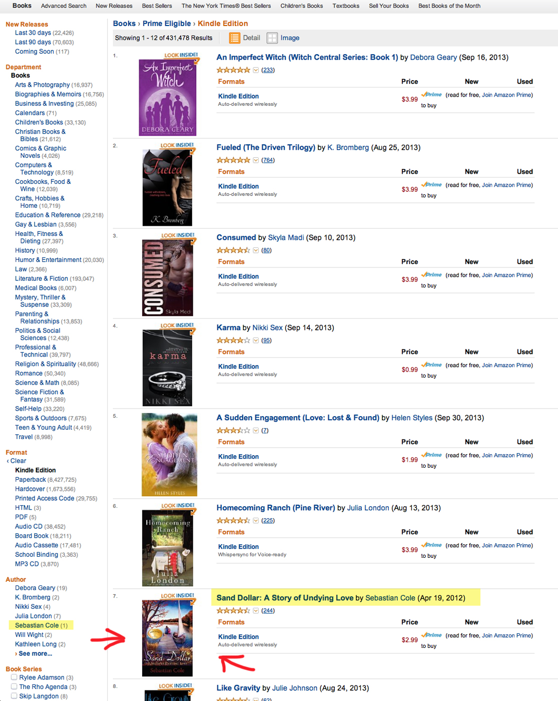 I just stumbled upon Amazon’s list of Prime Eligible Kindle Edition eBooks, and was surprised to see my debut novel, Sand Dollar: A Story of Undying Love, listed at #7 (out of 431,478)! I have no idea what criteria Amazon is using to sort this list, but thanks, Amazon!